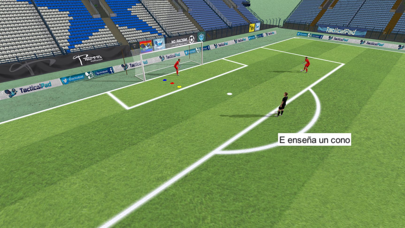 Tras tocar el cono, el portero regresará a la posición indicada y realizará una caída lateral hacia el lado previamente establecido, ejecutando el gesto técnico con precisión. - Reposicionamiento y golpeo libre: